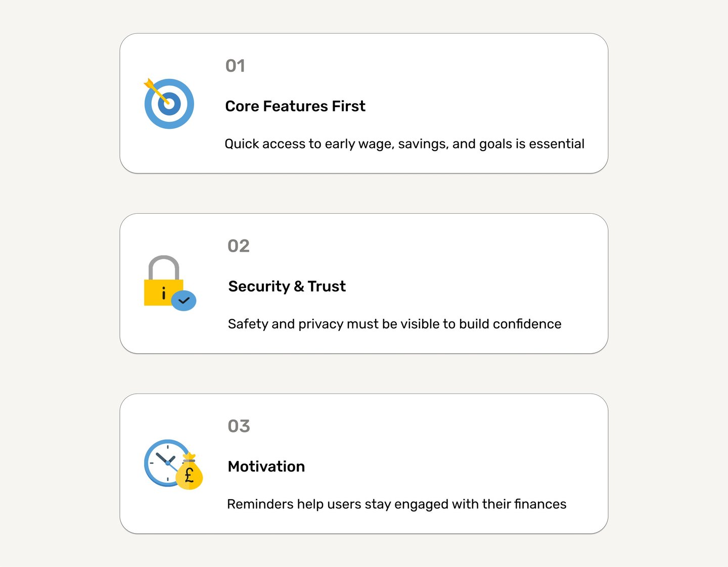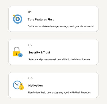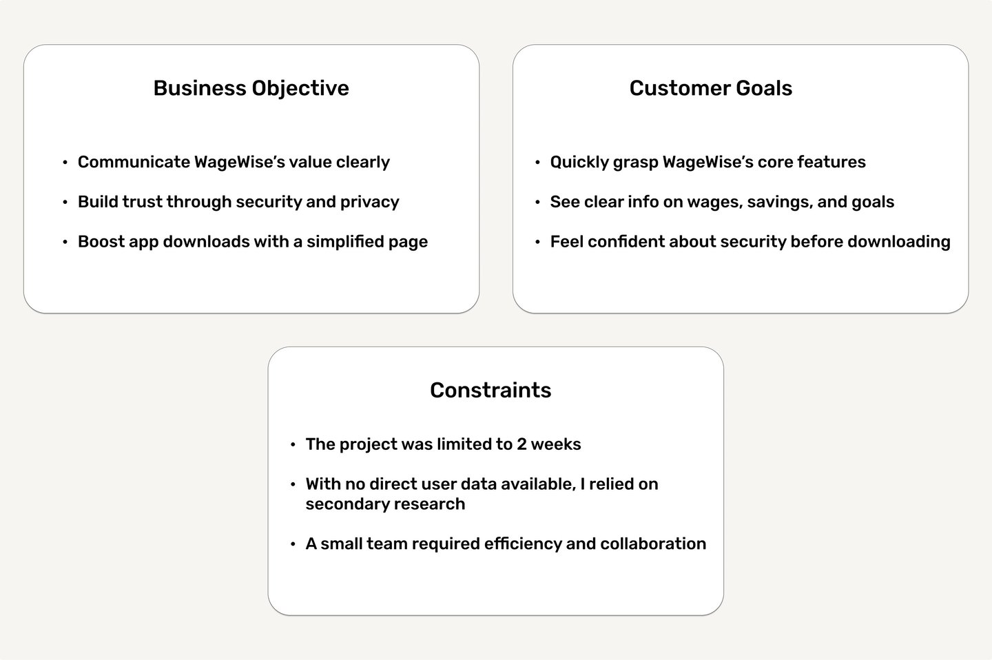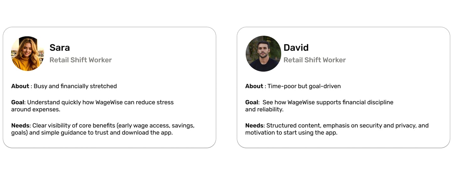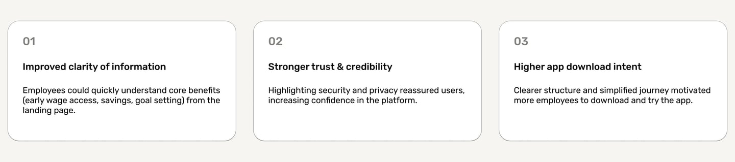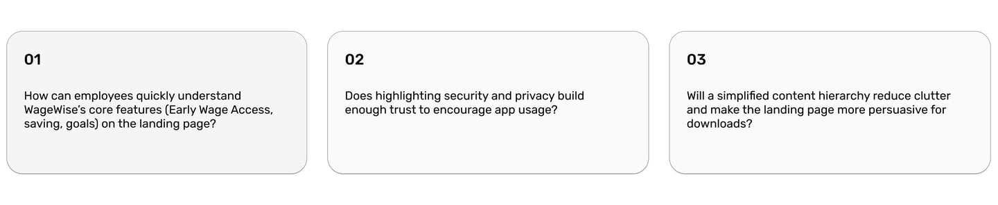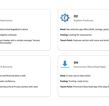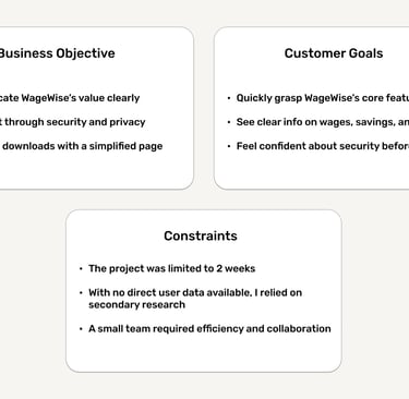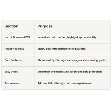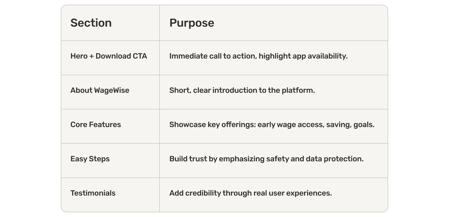 The previous landing page lacked clear structure, making it hard for employees to see WageWise’s core value. Key features like early wage access, savings, goals, and security were buried in clutter, reducing focus and motivation to download the app.