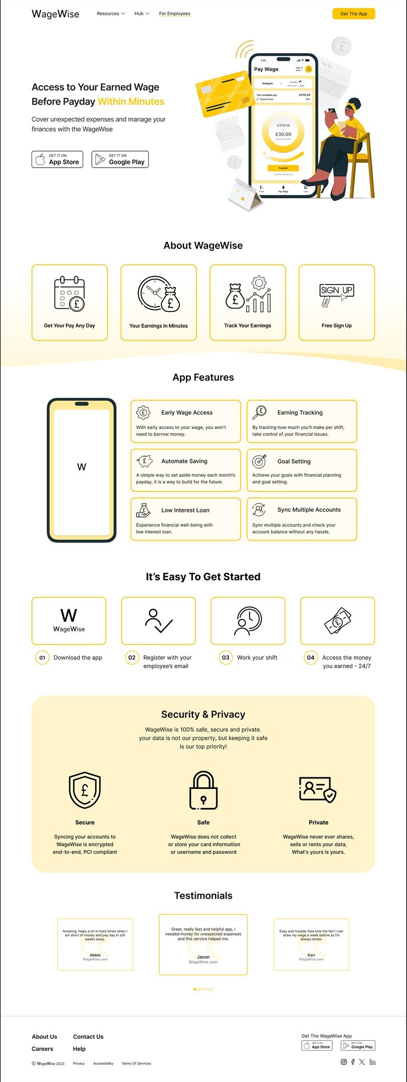 The WageWise landing page was designed to provide employees with quick access to essential information and motivate them to download the app.