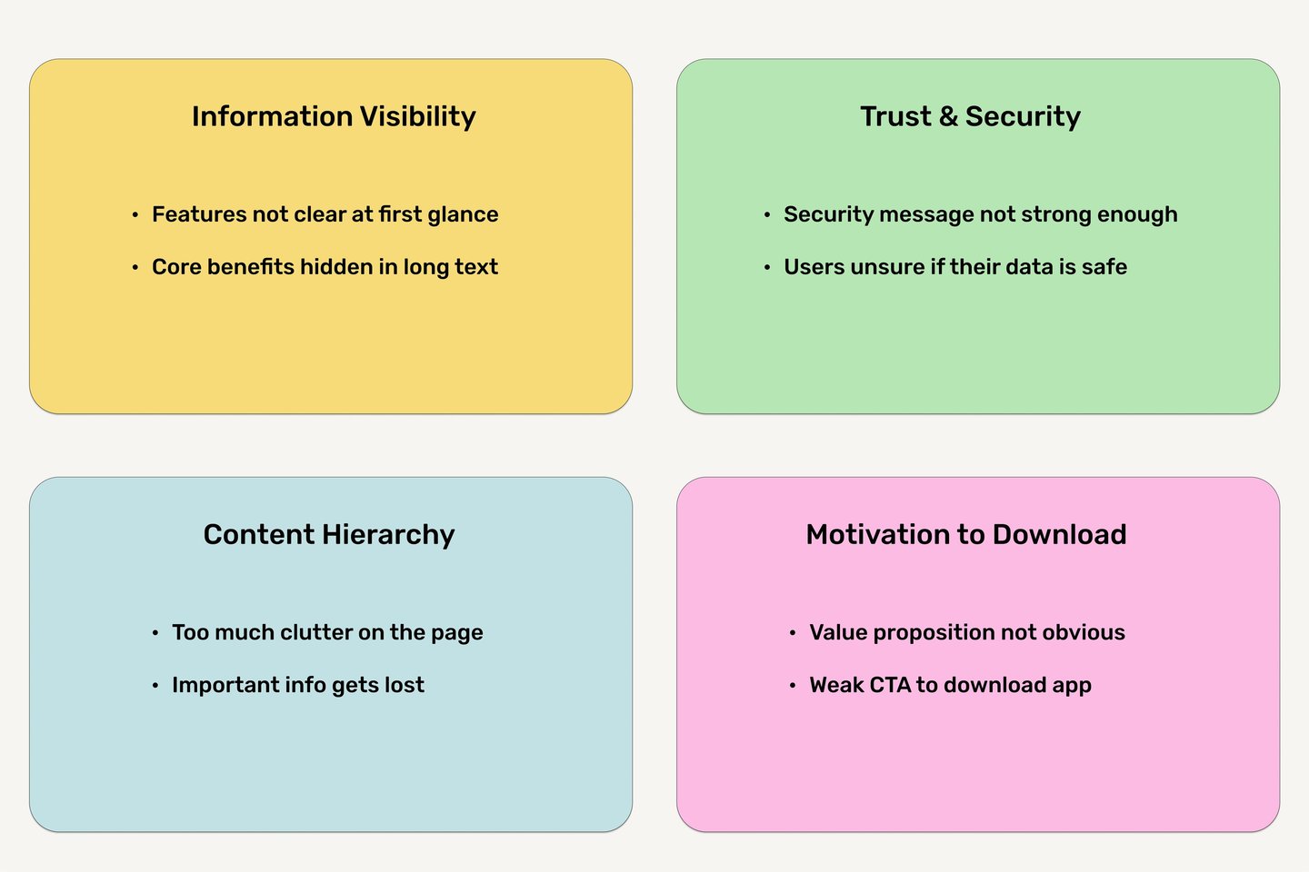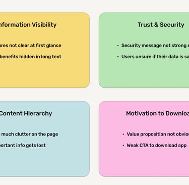 As part of the project extension, I focused on redesigning the landing page experience alongside the mobile app. My responsibility was to restructure the information flow so that key details (app benefits, features, steps to get started, and trust-building elements like security and testimonials) are immediately visible and easy to understand.
