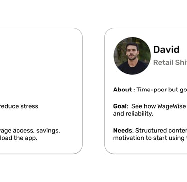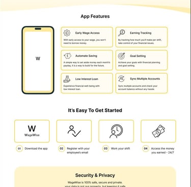 The page highlights the platform’s core value , accessing earned wages instantly — while presenting features like saving, loans, and goal setting in a clear, structured way. Through simplified information architecture, employees can quickly understand how WageWise works, why it’s secure, and how to get started, building trust and encouraging adoption.